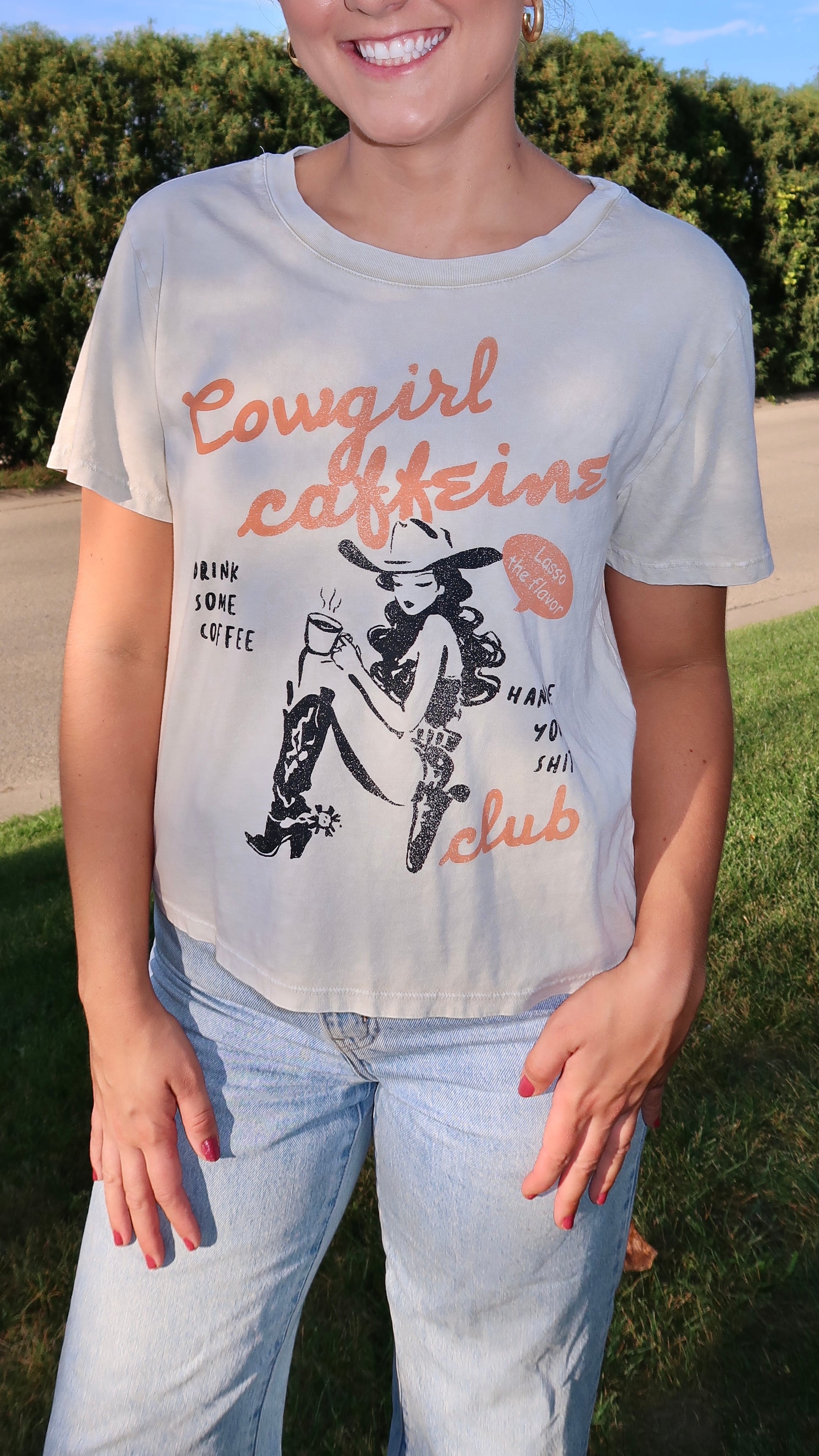 Designed with a shorter length for a flattering fit, this tee is pre-shrunk so it holds its shape wear after wear. The bold western-inspired graphic makes it a standout piece for cowgirls, caffeine lovers, and anyone who loves a lived-in classic.