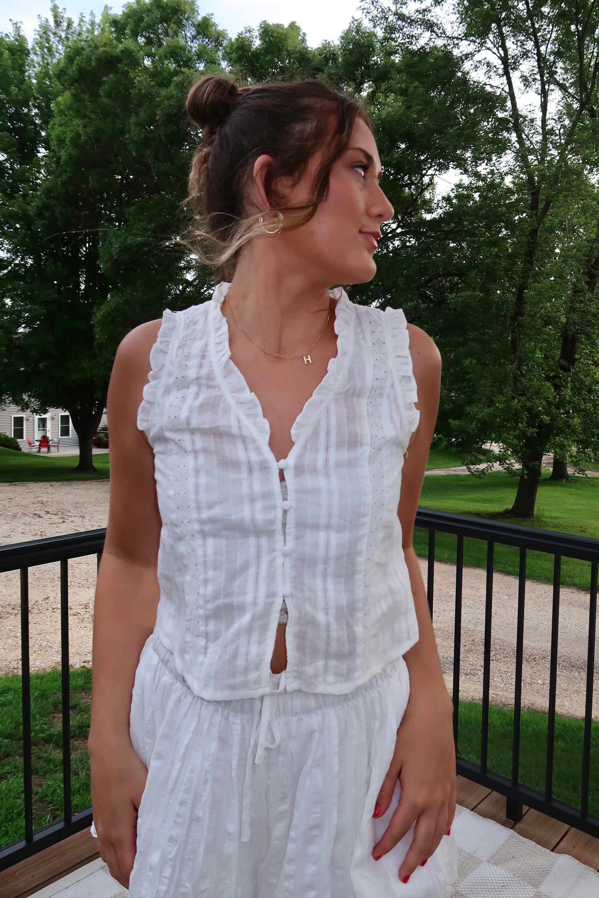 Boho ruffled V-neck tank with a button-front closure and tank top vest-style fit.