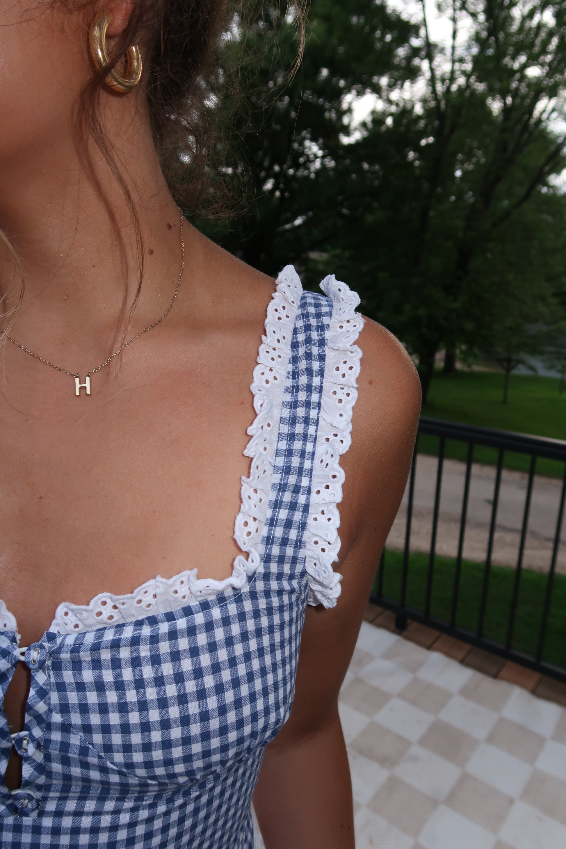 Bright gingham check bodysuit featuring a square neckline, wide adjustable straps, and eyelet lace trim. Designed with front button details and a smocked back for the perfect fit. A casual closet staple with a playful twist.