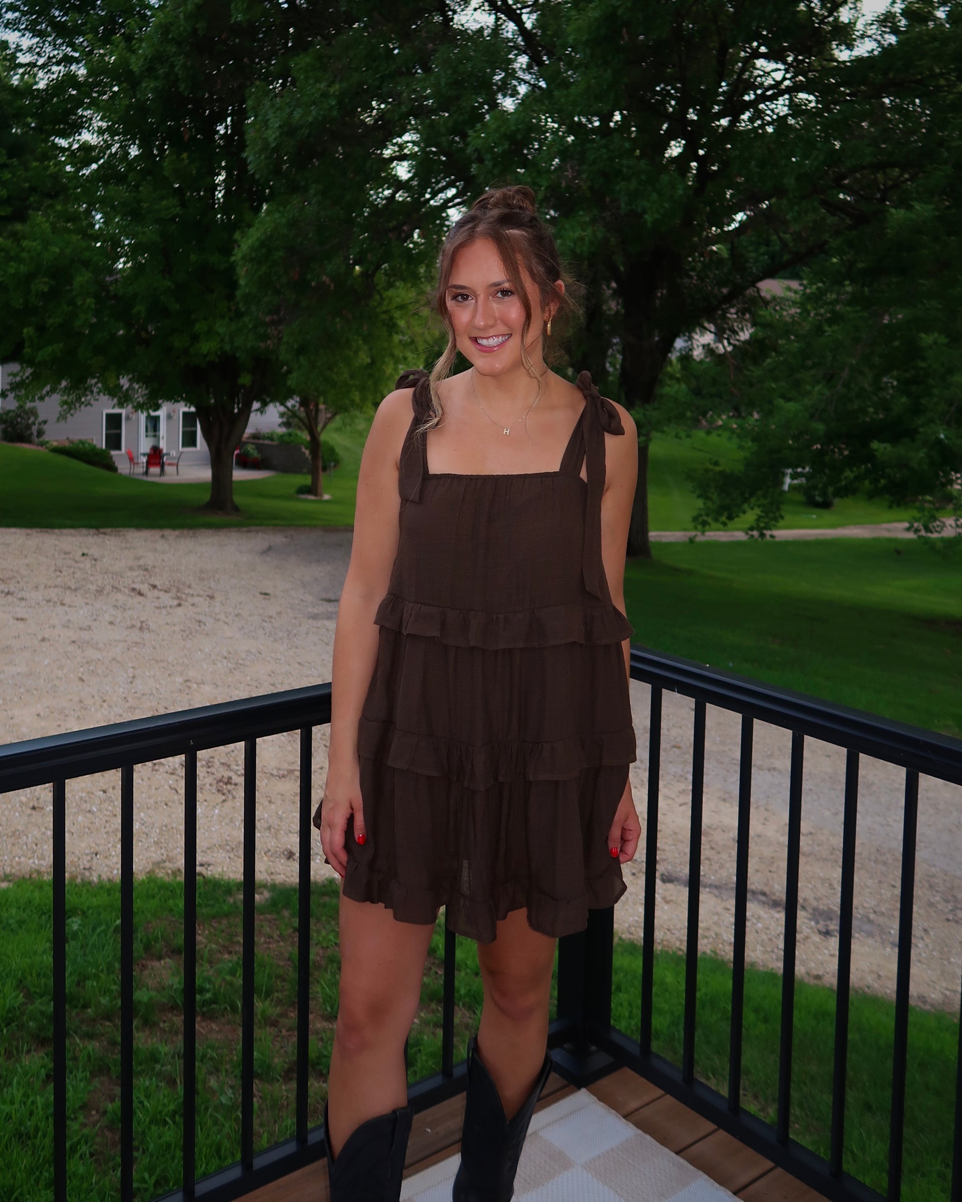 Brown Mini Dress featuring flirty self-tie straps and a square neckline. Designed with a flowy tiered silhouette and finished with ruffle trim for a soft, feminine touch. Made from 100% polyester.
